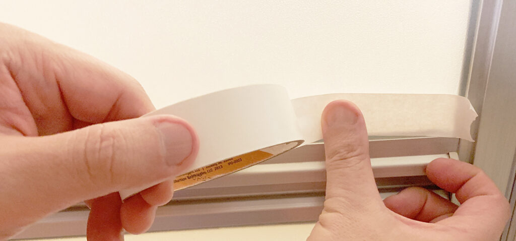 糊が素材に残りにくい性質を持つマスキングテープを、塗装をおこなわないガラス部分などに貼り付け、塗料が付着しないようにガードします。