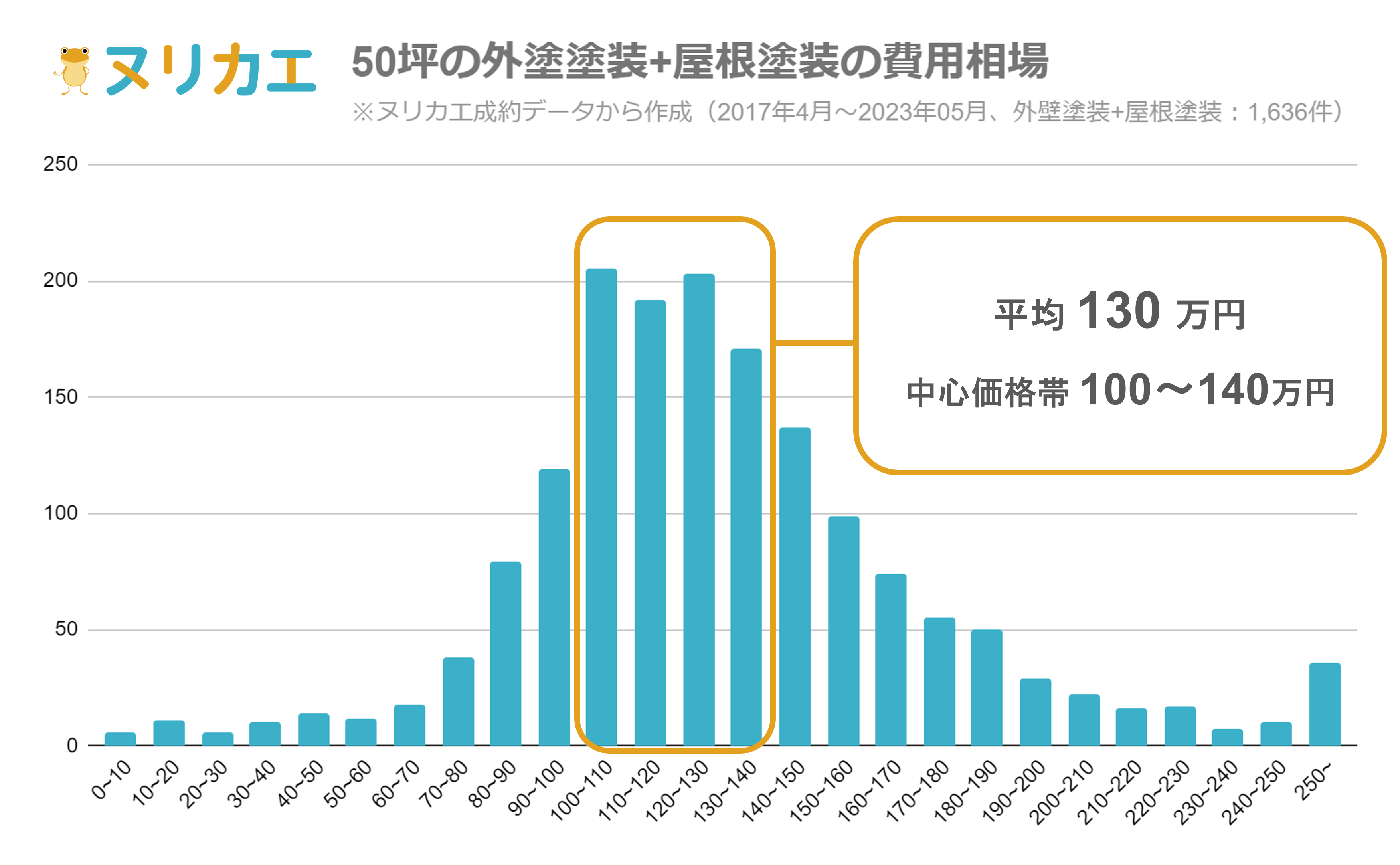 ※費用相場は本サービス「ヌリカエ」の2017年4月~2023年5月における成約データから算出(屋根塗装+外壁塗装:1,636件)
