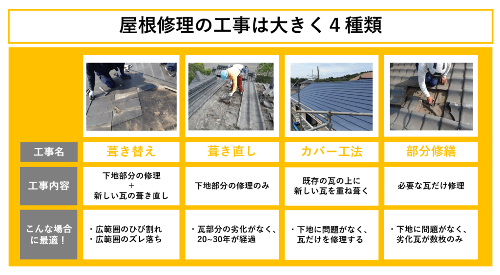• 屋根瓦修理には、4種類の工法がある!