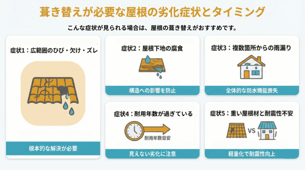 屋根葺き替えは、カバー工法や塗装では対応できない深刻な劣化が見られる場合に必要となります。ご自宅の屋根にこのような症状が現れたら、葺き替えを検討するタイミングです。