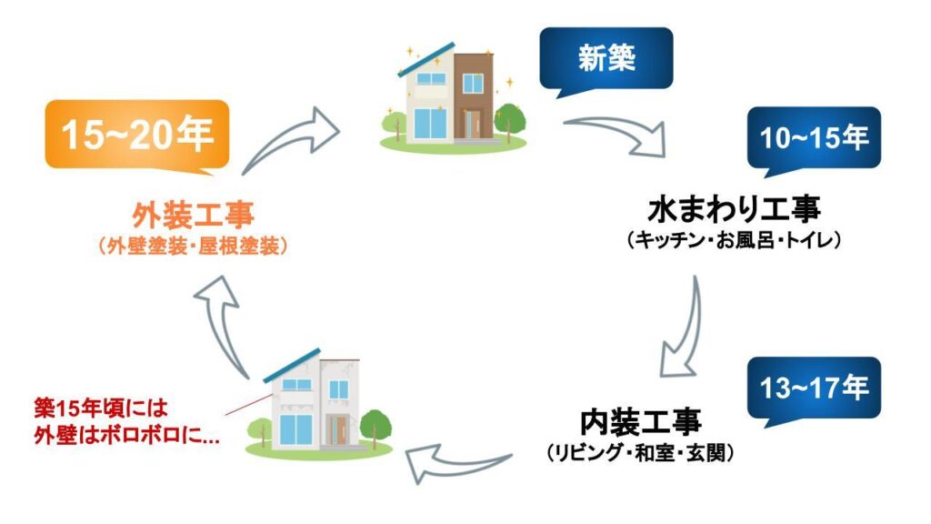 一般的な住宅の築年数別リフォームプランは次のようになります。