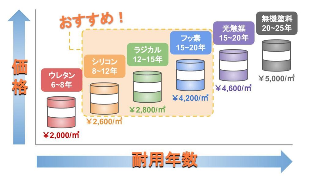 フッ素15~20年3800~4800円価格は高いものの、高い耐久性と耐候性を備えた塗料