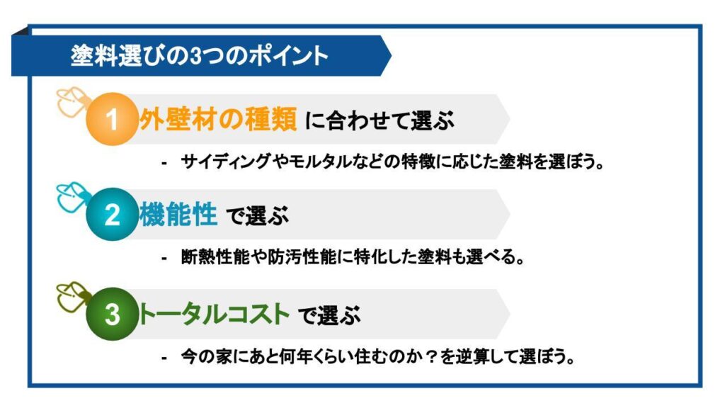 ・塗料は、外壁材の種類、機能性、トータルコストの3つで選ぶ