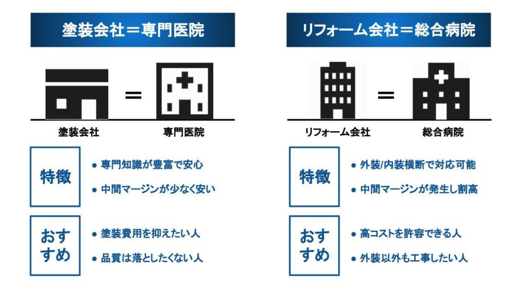 病院に例えると、塗装会社は皮膚科や眼科などの専門医院というイメージが近く、総合リフォーム会社(工務店)は、複数の領域を取り扱う総合病院のイメージが近いです。