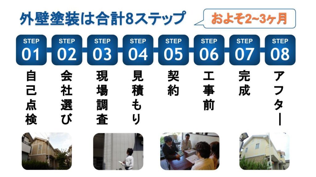 外壁塗装の流れは大きく8ステップ