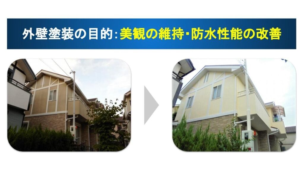 外壁塗装の目的は「美観の維持」と「防水性能の改善」の2つです。
