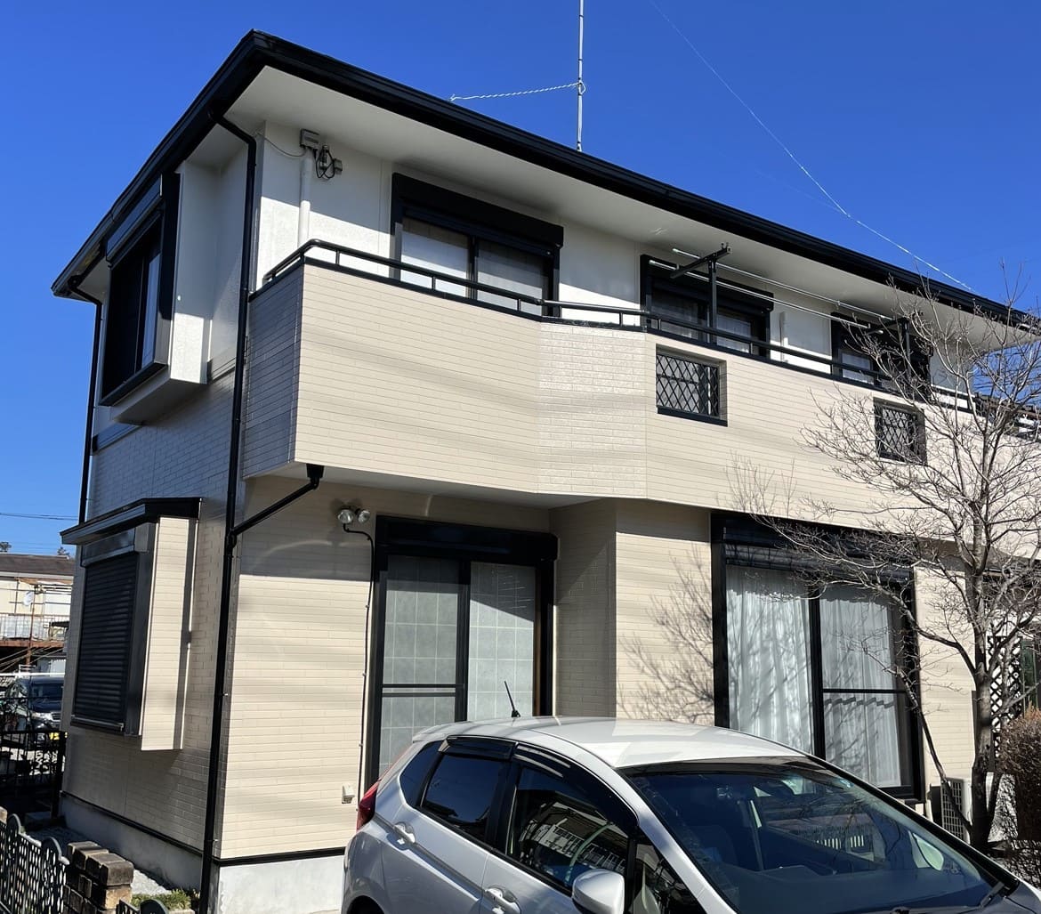 1階にベージュ、2階にホワイトの上下ツートンをした外壁の施工例です。