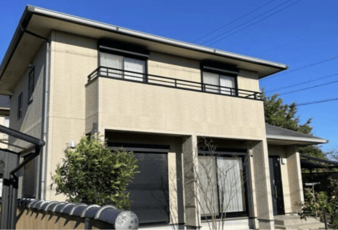 1階部分とベランダをベージュ、2階をホワイトでツートンにした事例です。