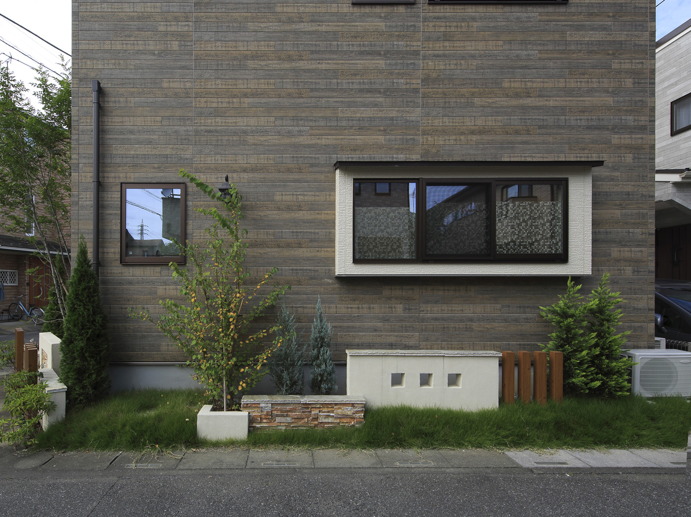 真っ直ぐなラインのブラウンとホワイトがコントラストとなり、2色使いでありながらもシンプルで洗練された印象を与えています。計算された陰影が、気品を感じさせる外壁です。
