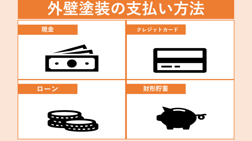 - 外壁塗装の支払い方法は、現金・クレジットカード・ローン・財形貯蓄の4つ。