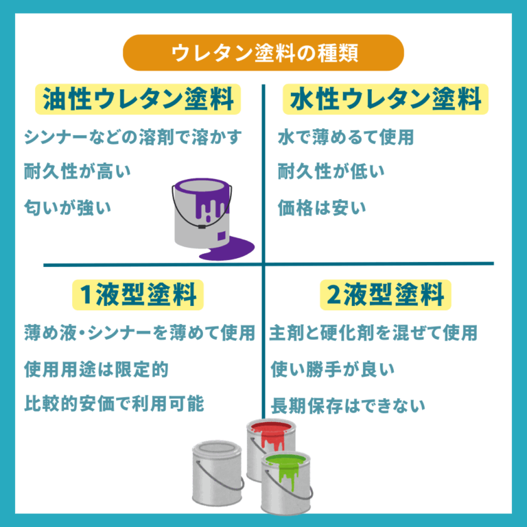 ウレタン塗料の種類には「油性(溶剤系)と水性」があり、さらに「1液型と2液型」に分かれます。