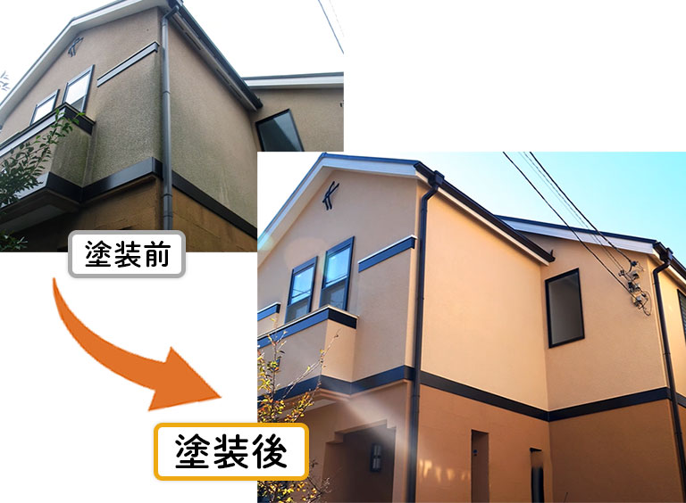 塗装前後の状態を比べると、外壁の美観が回復しただけでなく、作業前を配色を変えイメージチェンジもできています。