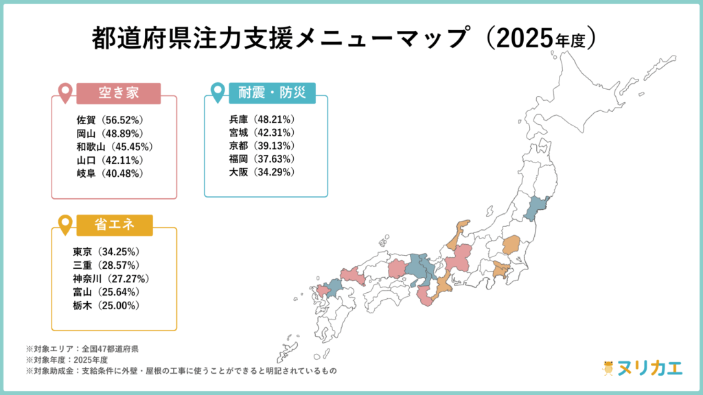 2025年時点でも、制度メニューの重点カテゴリは都道府県で差がある。