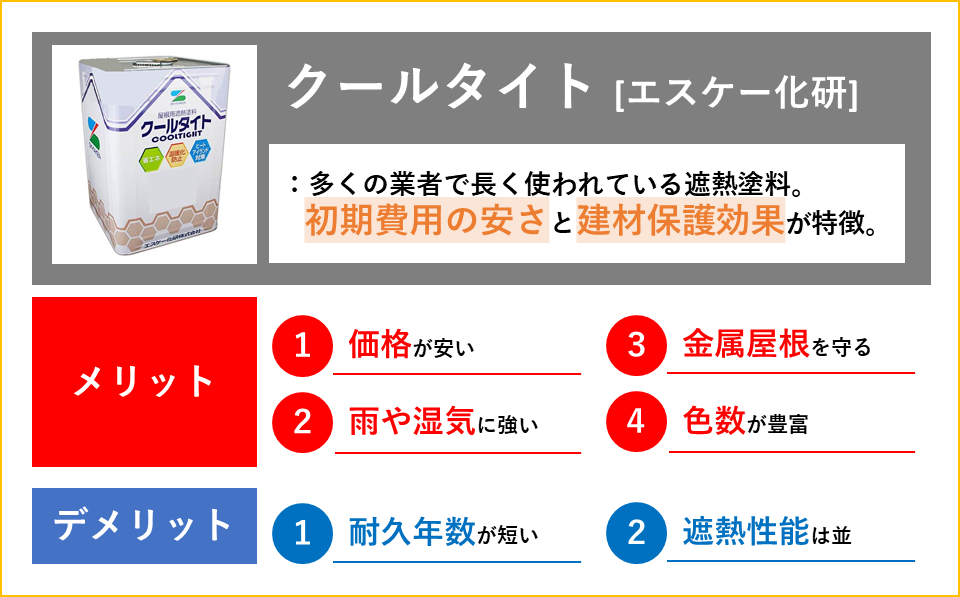 - 「クールタイト」の塗料価格は安価。耐用年数はやや短い