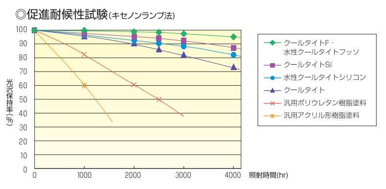 ※3 エスケー化研「クールタイトシリーズ」カタログより。高輝度のキセノンランプ照射による耐候性の実験結果。グラフの出典も同
