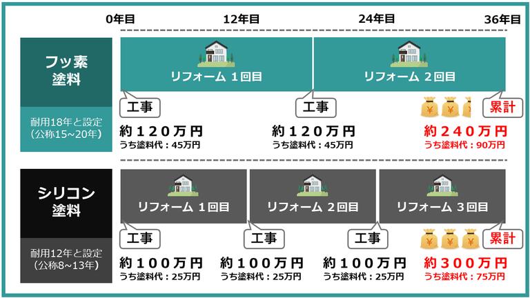 以下に、同じ塗装面積の家でフッ素塗料とシリコン塗料を使い続けた場合における、メンテナンス費用の差の一例をご紹介します。