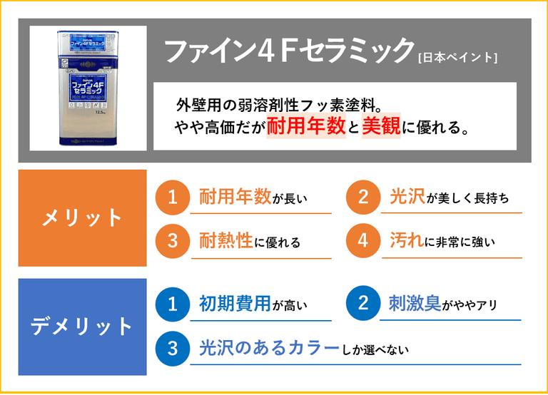 - 「ファイン4Fセラミック」は高価格・長耐用な最上グレードの塗料