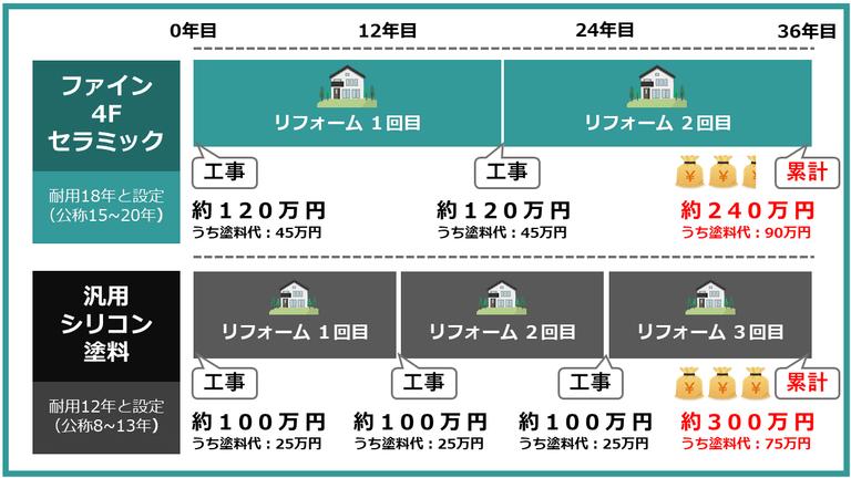 「ファイン4Fセラミック」は塗料代が高価ですが、長い目で見るとシリコン塗料を使用した場合よりもお得になる場合がほとんどです。