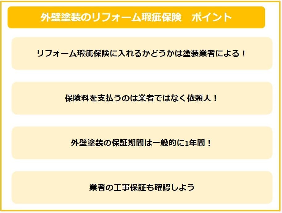 ここまででもお伝えした通り、塗装業者によっては自社で工事保証を行っているところもあります。リフォーム瑕疵保険は業者によっても加入できるかどうかが異なりますし、真っ先に保険のことを考えるのではなく、まずは業者に「万が一の場合の保証はあるのか?」ということを確認しましょう。