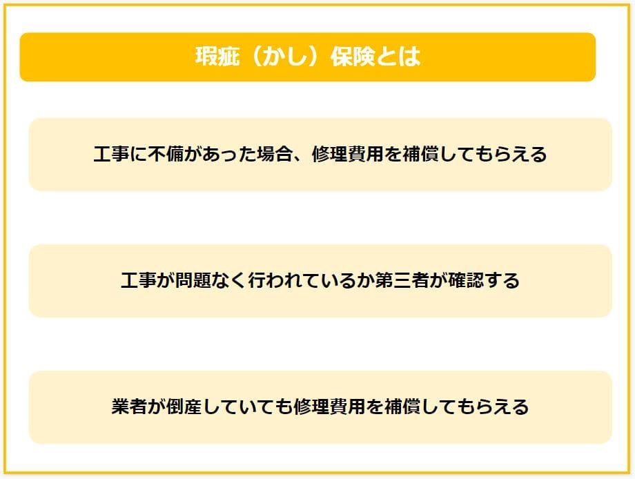 瑕疵(かし)保険とは、契約に従って行われた工事の結果に不備があった場合に、依頼人自身の負担なく修理を行うための保険です。