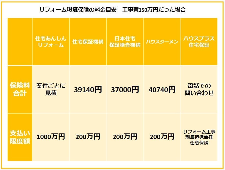 参考までに、塗装工事にかかる費用が150万円だった場合の保険料を各法人で比較するとこのような費用感になります。