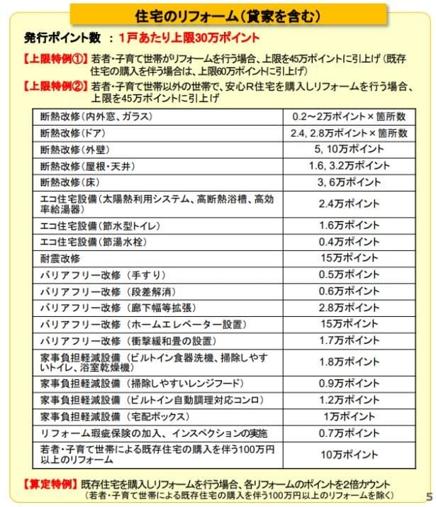 ほかにも、家事を軽減するためのリフォーム(掃除しやすいトイレ、ビルトイン食洗器など)やバリアフリーリフォーム、エコリフォームなどを合わせて行うことで、一戸あたり最大30万ポイント(30万円相当)が付与されます。このポイントはエコ家電などに交換できる予定です!
