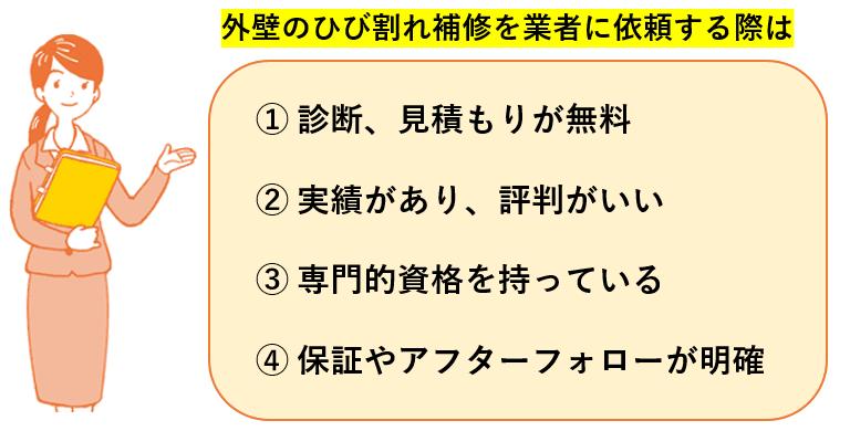 業者に外壁のひび割れを依頼する場合、以上の点に注意しましょう。これらの点を守ることで、信頼できる業者を見つけられます。
