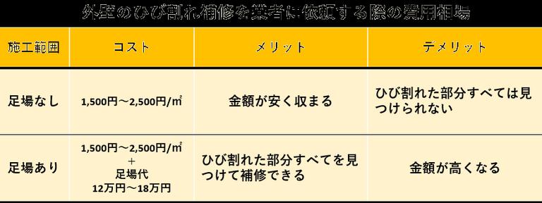 このように、ひび割れの補修費用は「足場」によって大きく違ってきます。詳しくは上記の表を確認しましょう。