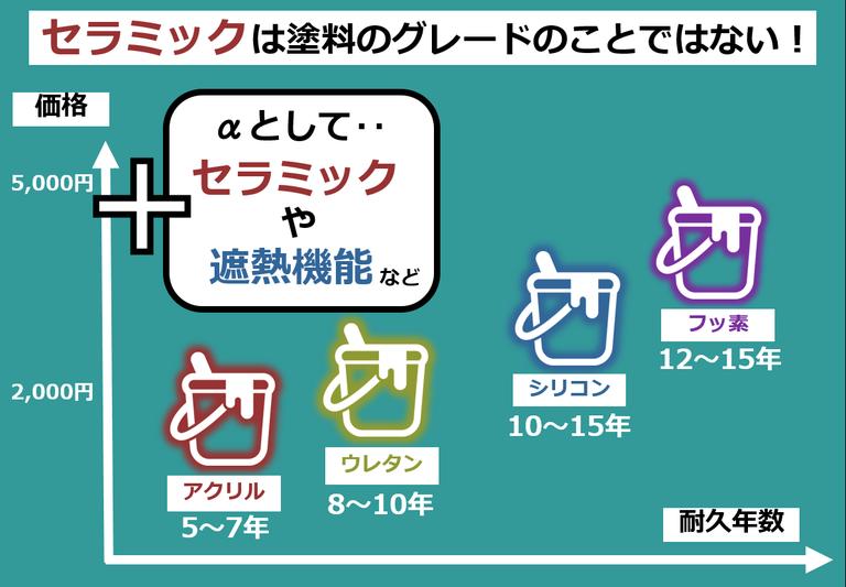 セラミックは無機物のため、セラミック100%の塗料は存在しません。そのため、耐用年数はベースとなる塗料のグレード自体に紐づきます。つまり、例えば、アクリル塗料でもウレタン塗料であっても、少しでもセラミックが入っていれば、セラミック塗料と呼ぶことが出来ます。