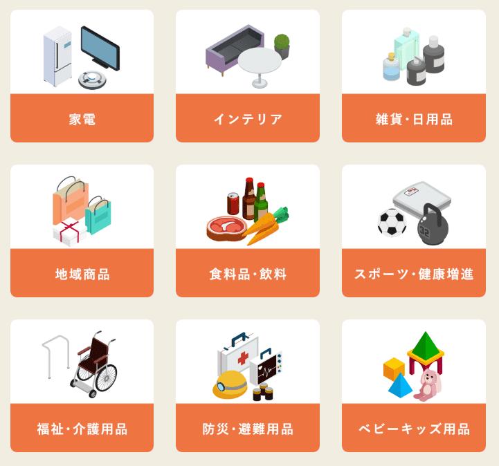 商品のジャンルは「家電」「インテリア」「雑貨・日用品」「食料品・飲料」「スポーツ・健康増進」「福祉・介護用品」「防災・避難用品」「ベビー・キッズ用品」「地場産品」など多数あります。