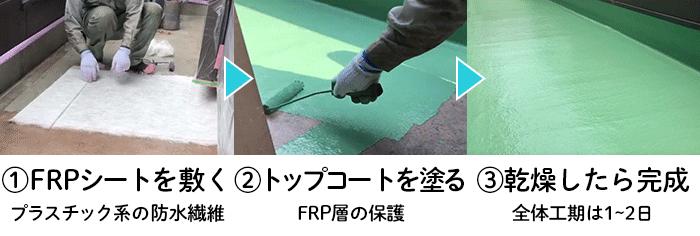 | FRP防水 | 床面にプラスチック繊維を敷いたあとに樹脂で固めて防水層を作る工法。耐用年数は10~13年程度。5~6年目にトップコートの塗り替えが必要。 |