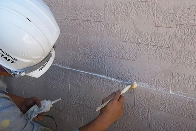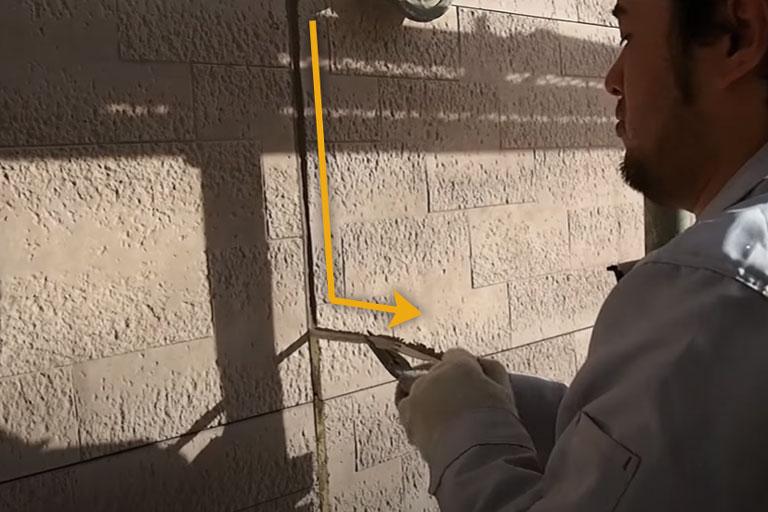 例えば、水平方向の目地に隙間が空いてしまっている場合は、コーキング材で埋め、刷毛で押し込みながら平らにします。
