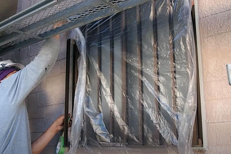 塗料が窓ガラスやサッシ等に飛ばないように、あらかじめ汚してはいけない部分をシートで覆います(約1日間)。