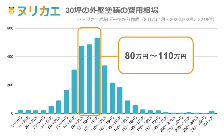 そこで本章では、ヌリカエで実際に外壁塗装工事を行った方3,248件のデータより、30坪の戸建てにおける外壁塗装の相場をご紹介しています。