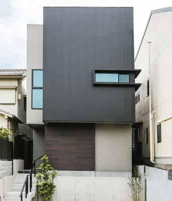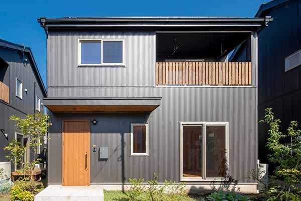 光沢のあるブラック系の木目調ガルバリウムを使った、スタイリッシュな外壁。