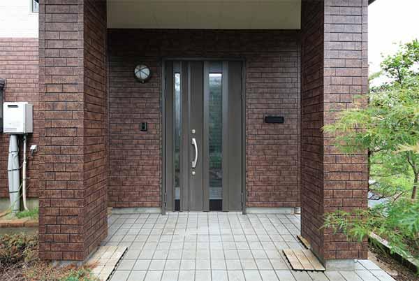 壁と柱を同じ色のレンガ調ガルバリウム鋼板で揃えることで、シックで高級感のある玄関を実現。