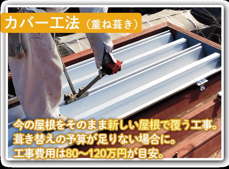 また、全体修理であれば屋根の症状や工事の規模、修理方法よって変わってきますが葺き替えで140~200万円、葺き直しで100~180万円、カバー工法で80~120万円程です。