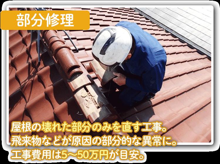 部分修理:割れた瓦の交換、雨漏り箇所のコーキングなど、ピンポイントで修理する方法