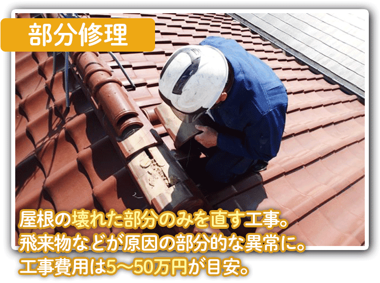 | 部分修理 | 瓦の部分的な破損やズレを直す | 瓦の割れ、ズレ 瓦の釘浮き | 1~3日 | 5~50万円 |