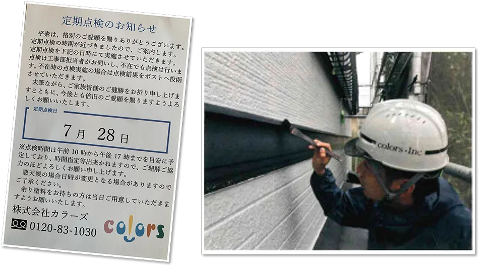 責任施工だからできる長期サポート。1・5・10年目の無料巡回と自社対応の補修で、施工後の安心をお約束します。